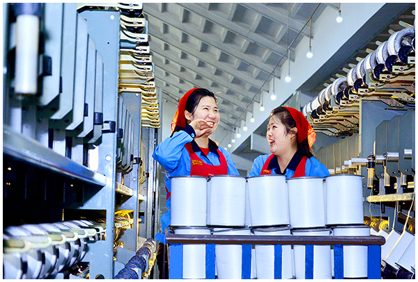 Girls spinning silk thread at their workplace are full of laughter since modern machinery and equipment stand in rows, the floor glitters everywhere and clean air flows into the worksite.